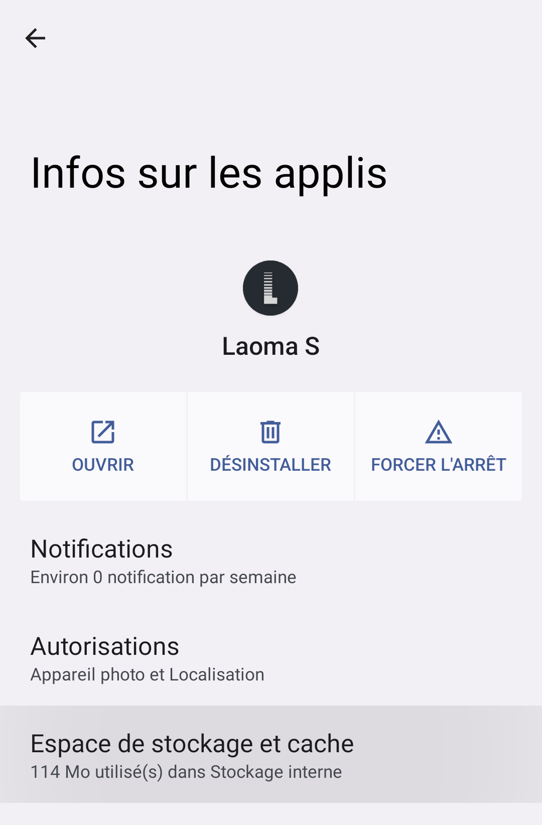 Pour le réaliser, il faut faire un appui long sur l’application Laoma S puis cliquer sur “Infos sur l’appli”.
